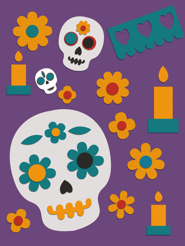 This design was inspired by the ofrendas (offerings) placed on Día de Muertos altars. Decorated with skulls, candles, papel picado, and flowers to honor loved ones who have passed. The composition uses informal balance, arranging the elements asymmetrically to capture the natural variety and rhythm of a real ofrenda. Created in Illustrator and textured in Photoshop for a handmade papel effect.